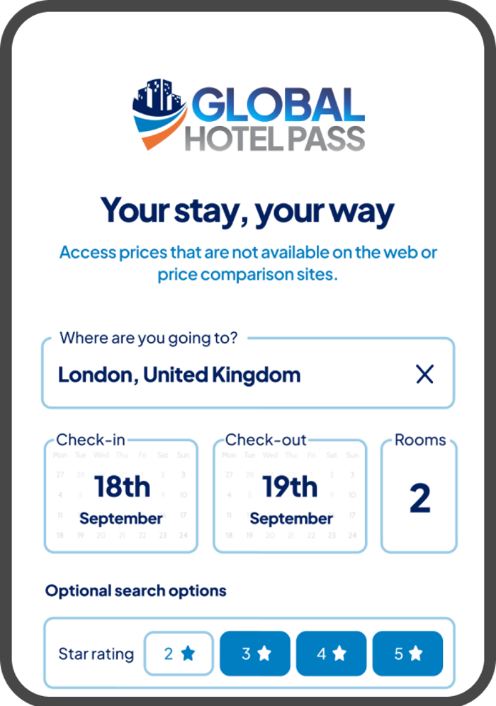 Global Hotel Pass is DRG’s newest product in the DRG portfolio, providing customers with discounts of up to 50% off 1.4 million hotels worldwide. With exclusive discounts and global coverage, we’ve got the perfect product for a wide range of customer demographics. Our brand-new product can be utilised for customer acquisition and retention, recommending friends or rewarding loyalty.